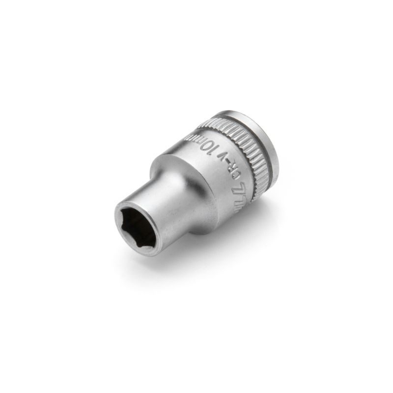 Herramienta de torsion de alta calidad fabricada en aleacion de Cromo Vanadio (Cr-V) con un acabado cromado mate que brinda una proteccion superior contra la corrosion y el desgaste. Su diseño hexagonal de 6 puntas ha sido mecanizado con precision para maximizar el contacto con las caras del sujetador, distribuyendo la fuerza de manera uniforme y evitando el redondeo de las aristas. Es una pieza compacta y robusta, diseñada para acoplarse perfectamente a criques, destornilladores de encastre y extensiones de 1/4, garantizando un rendimiento optimo en tareas de precision.