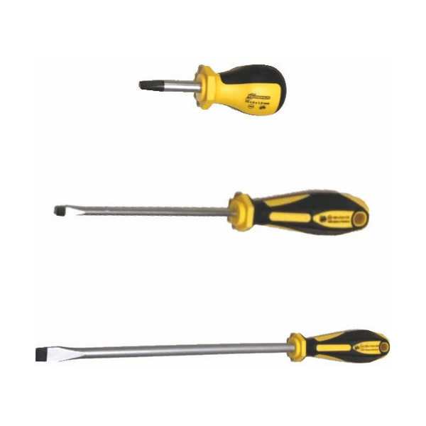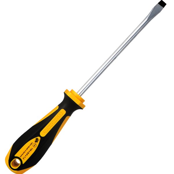 Destornillador plano de alta resistencia diseñado para uso industrial y profesional. La punta plana está mecanizada con precisión para garantizar un encastre perfecto, reduciendo el riesgo de zafaduras y daños en la cabeza del tornillo.