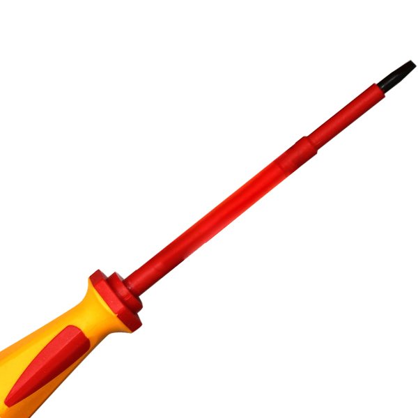 Destornillador aislado profesional diseñado para trabajos bajo tensión de hasta 1000V AC. Cumple con las estrictas normativas internacionales VDE y GS, garantizando la máxima seguridad para el operario en instalaciones eléctricas y tableros.