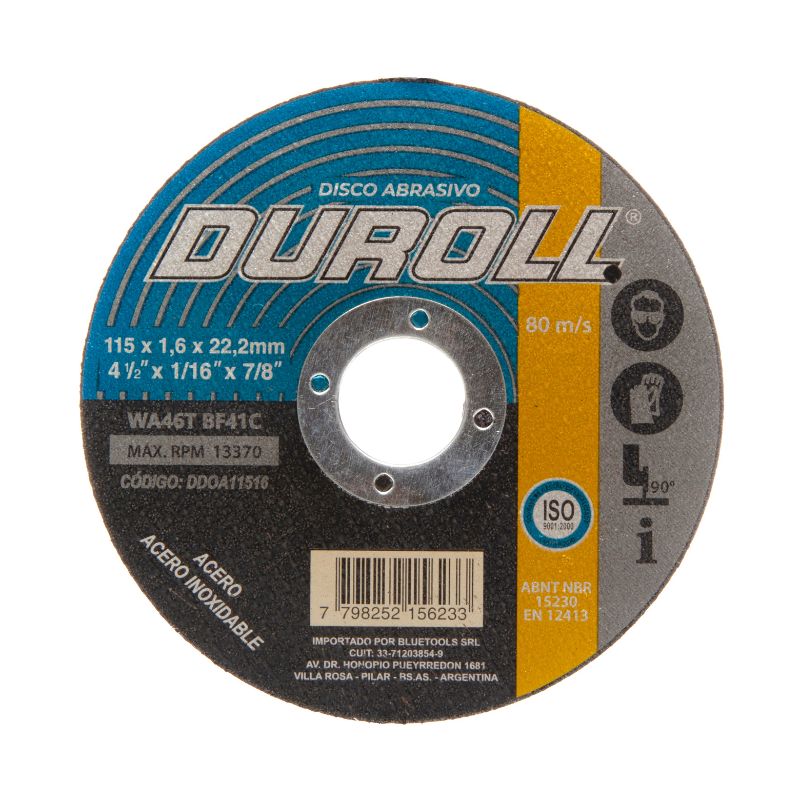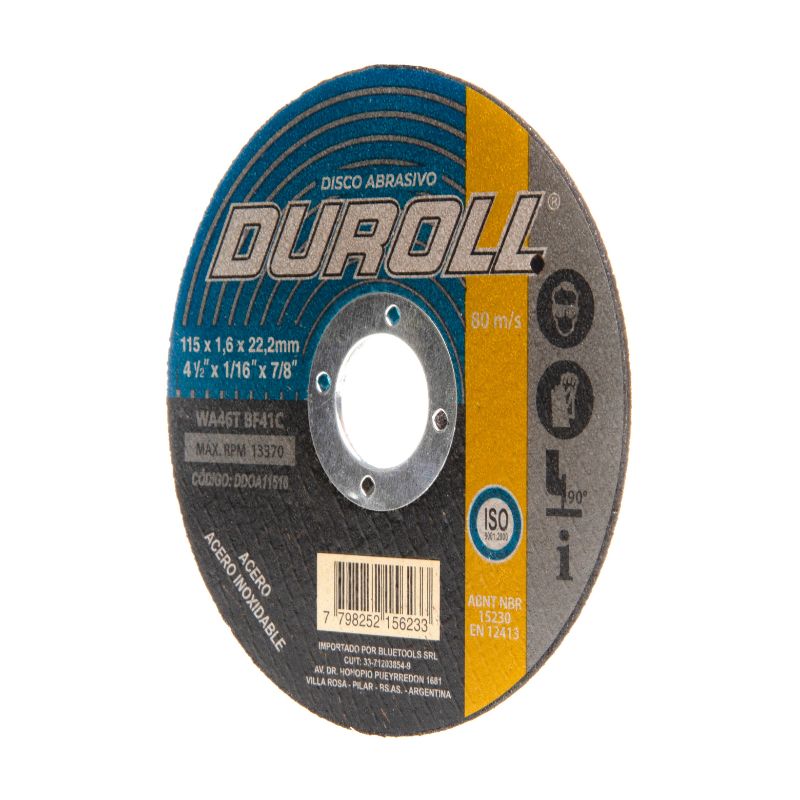 Insumo abrasivo industrial desarrollado para el uso intensivo en amoladoras angulares y maquinas de corte sensitivas. El disco Duroll utiliza granos de oxido de aluminio ligados con resinas sinteticas de alta resistencia, lo que proporciona una estructura compacta y duradera que soporta altas velocidades perifericas sin vibraciones excesivas. Los modelos de espesor fino (1 mm a 1.9 mm) estan optimizados para cortes rapidos y limpios en acero inoxidable y chapas delgadas, mientras que las versiones de mayor espesor son ideales para el tronzado de materiales macizos y aplicaciones que requieren mayor rigidez lateral. Su diseño cumple con las normas internacionales de seguridad, ofreciendo un desempeño equilibrado entre capacidad de remocion y resistencia al desgaste.