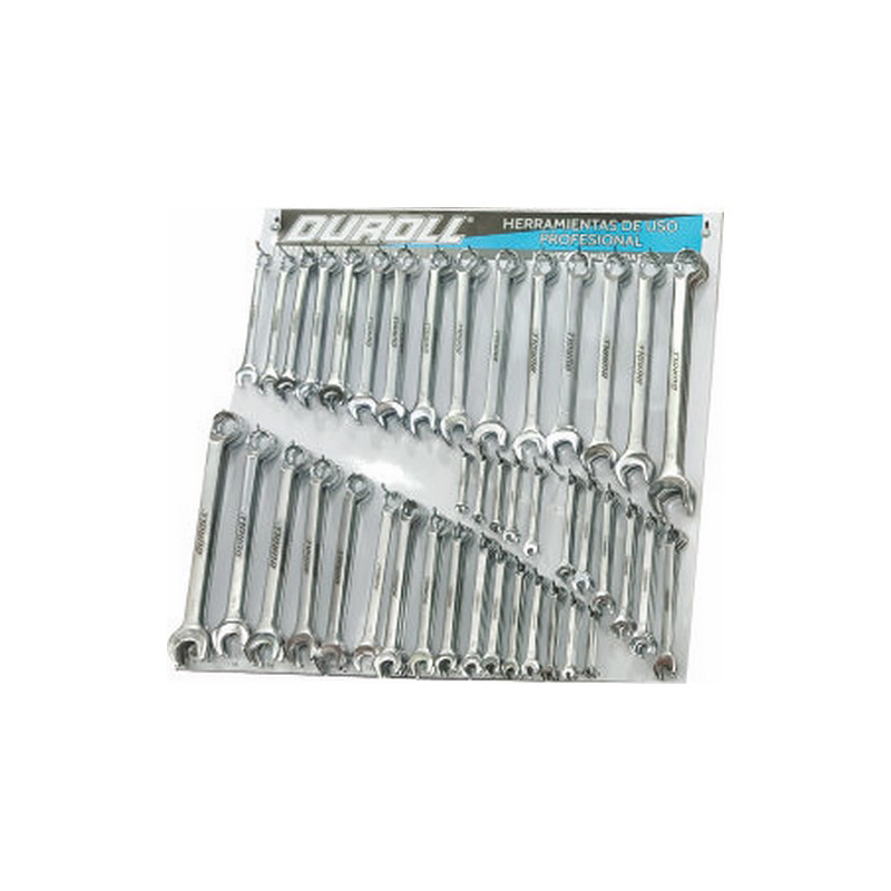 Organizacion profesional y exhibicion de alto impacto para herramientas manuales. El exhibidor de llaves combinadas Duroll de 800 x 800 mm es la solucion logistica indispensable para ferreterias, talleres mecanicos y centros de mantenimiento que buscan un orden impecable. Fabricado en chapa de acero de alta resistencia con procesos de plegado y punzonado de precision, este panel permite organizar juegos completos de llaves de diversas medidas. Sus 43 ganchos distribuidos de forma estrategica garantizan una visualizacion clara de cada medida, facilitando el control de stock y agilizando el acceso a la herramienta adecuada en entornos de trabajo intensivo.