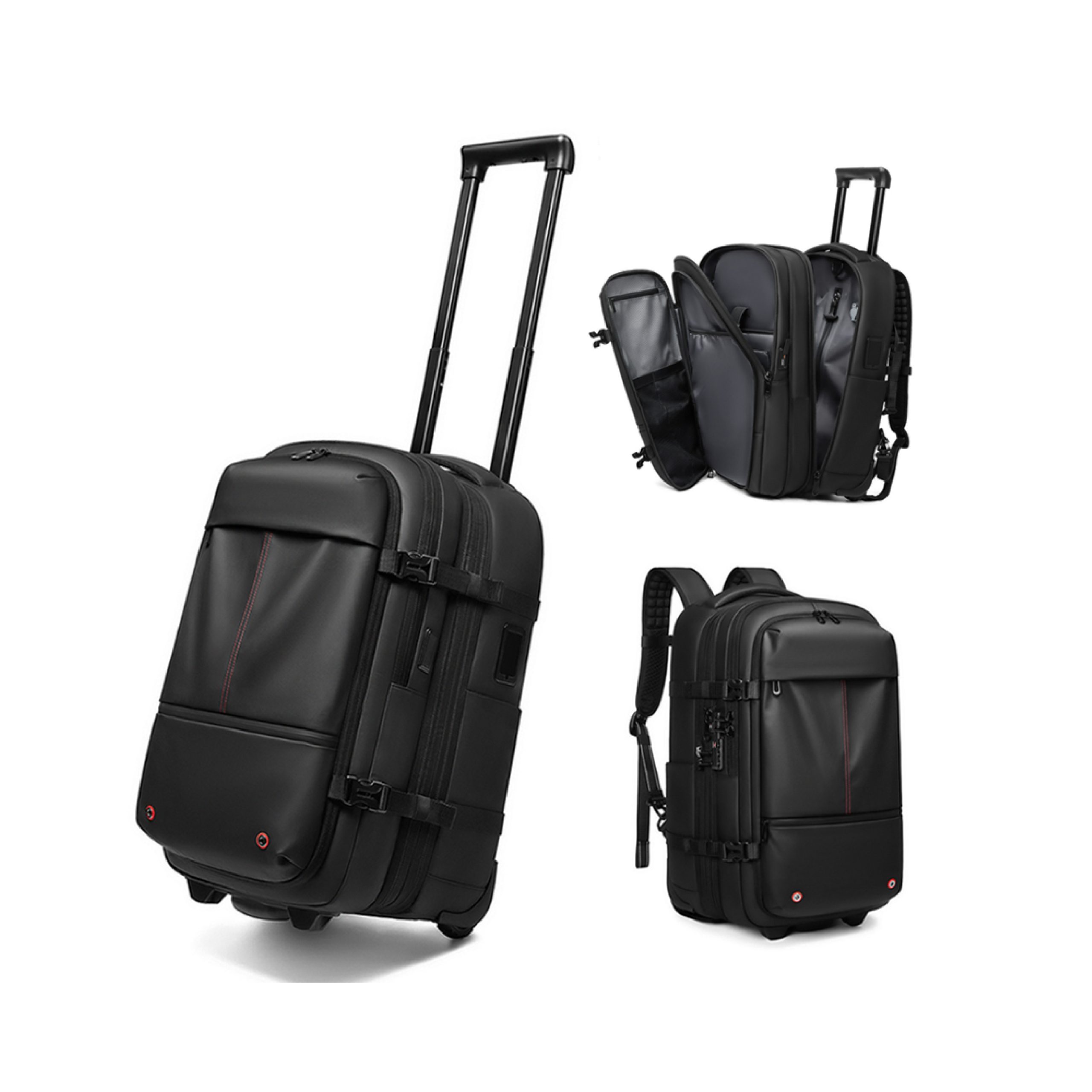 Mochila de viaje inteligente con bomba de vacío incorporada y ruedas para transporte. Expandible, resistente y equipada con cerradura TSA. Incluye compartimento para laptop, cierres SBS y diseño reforzado para mayor durabilidad. Con puerto USB.